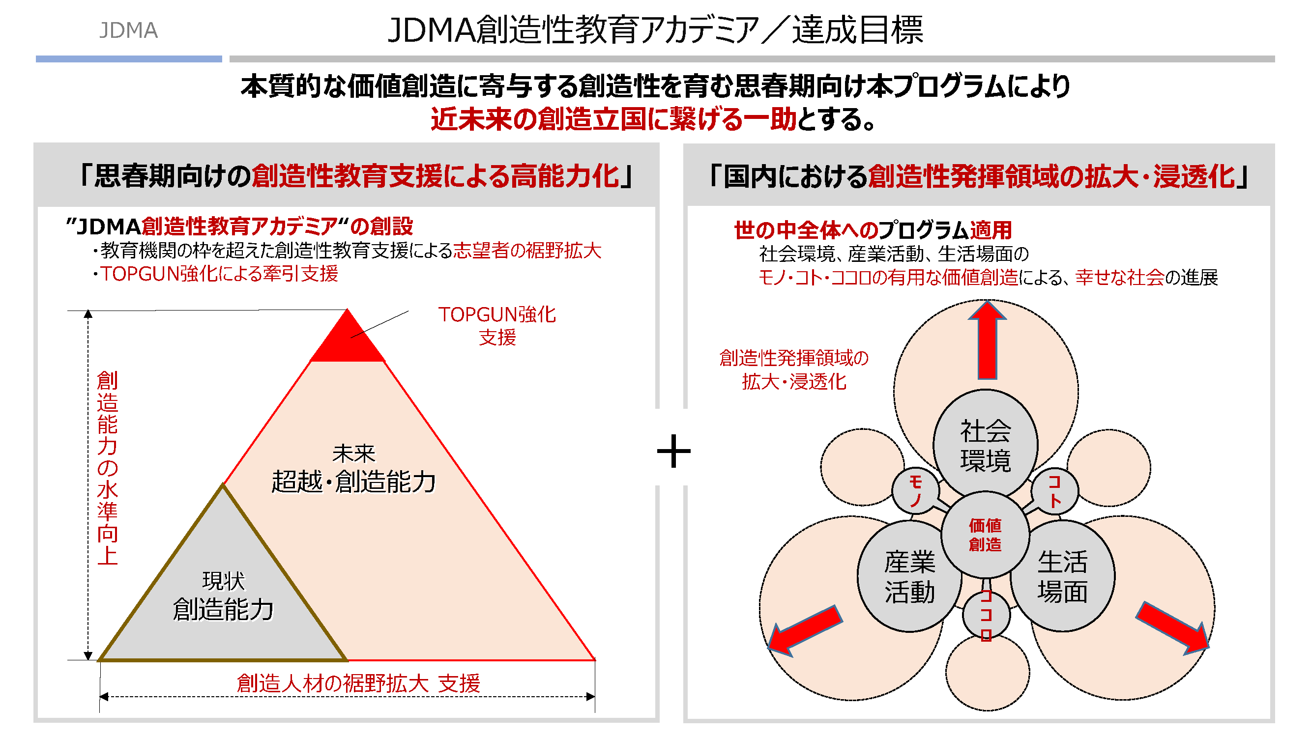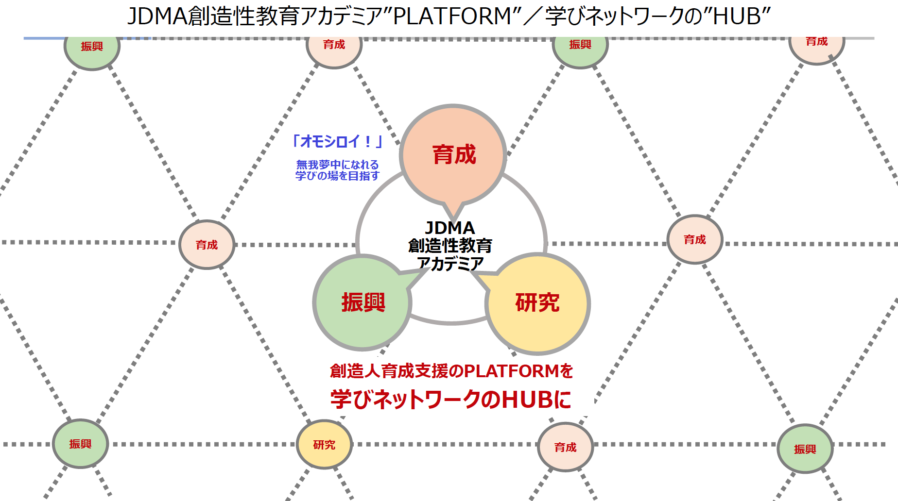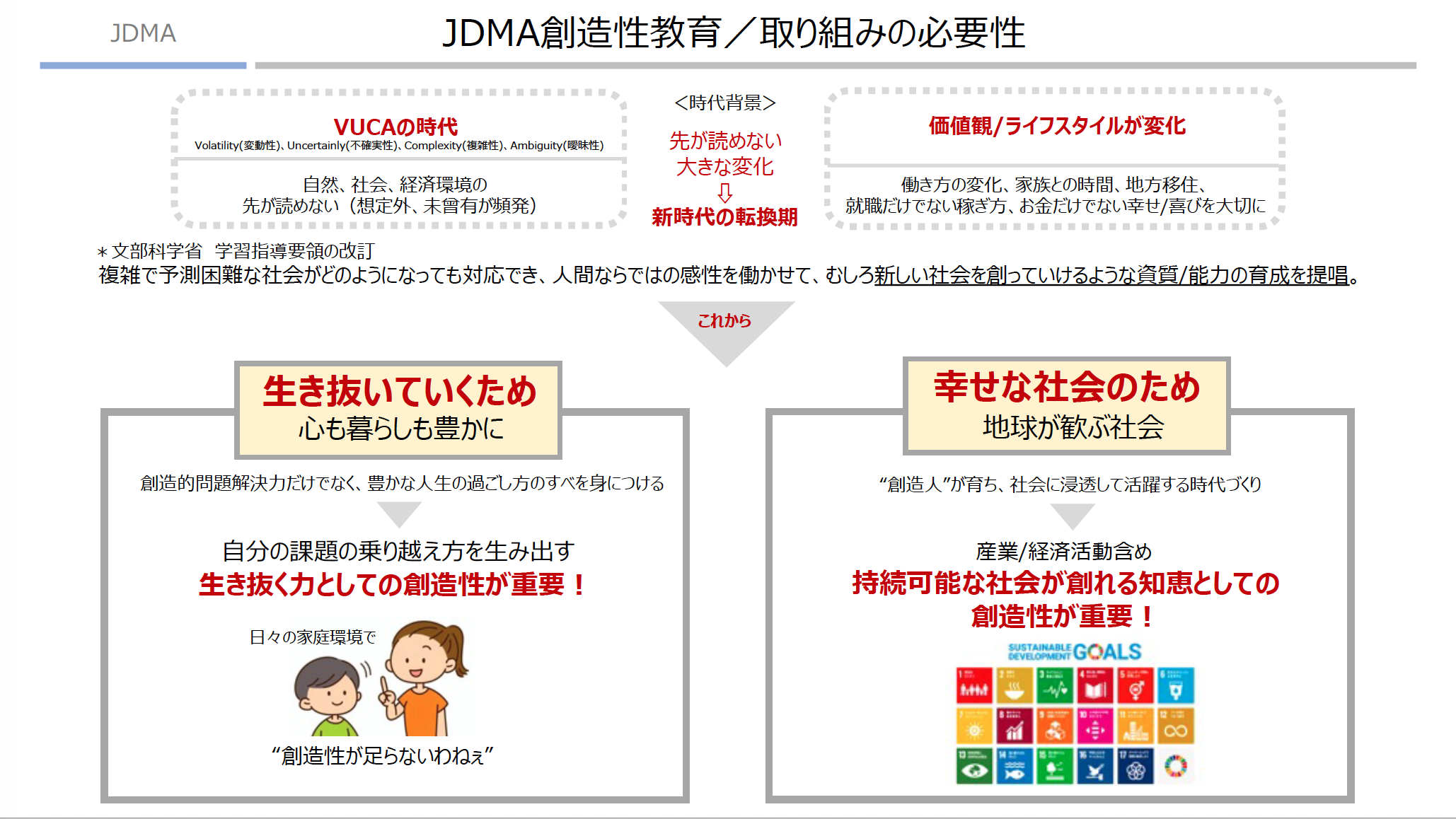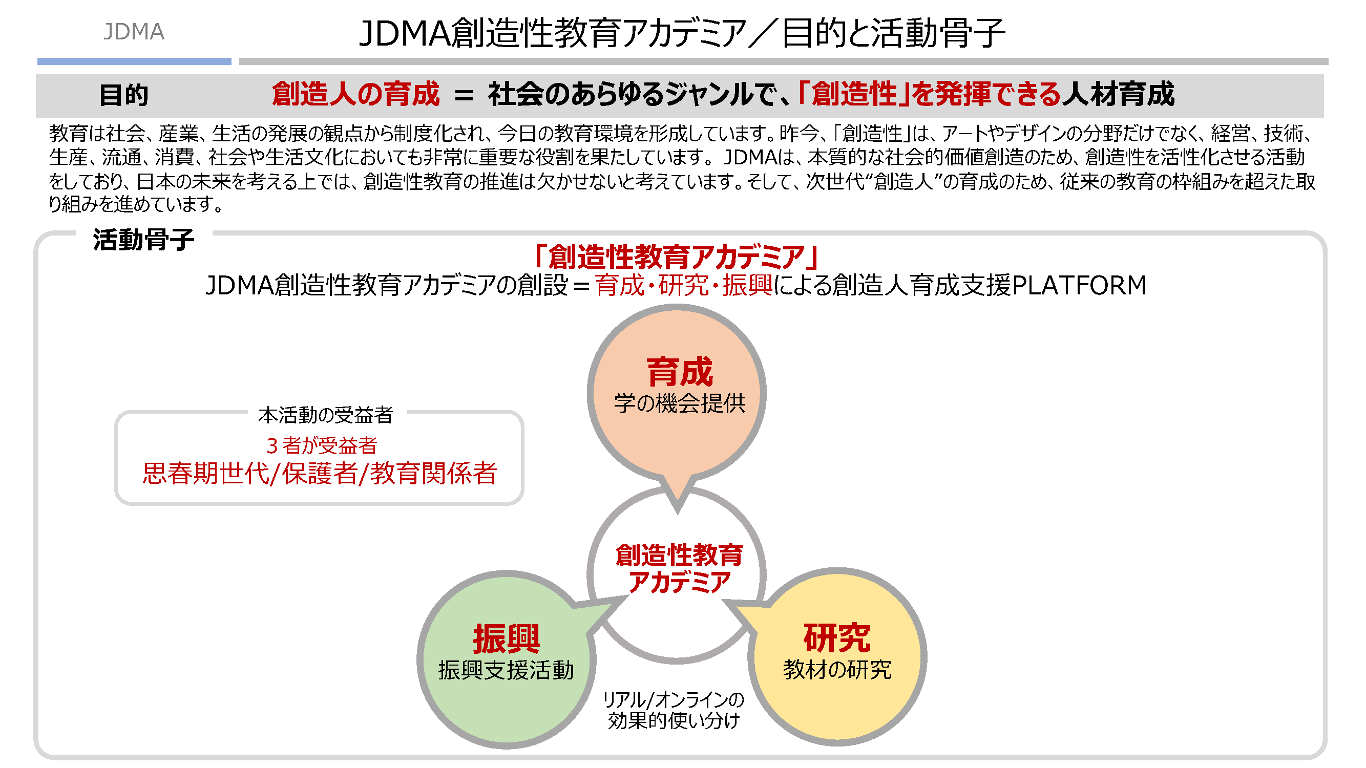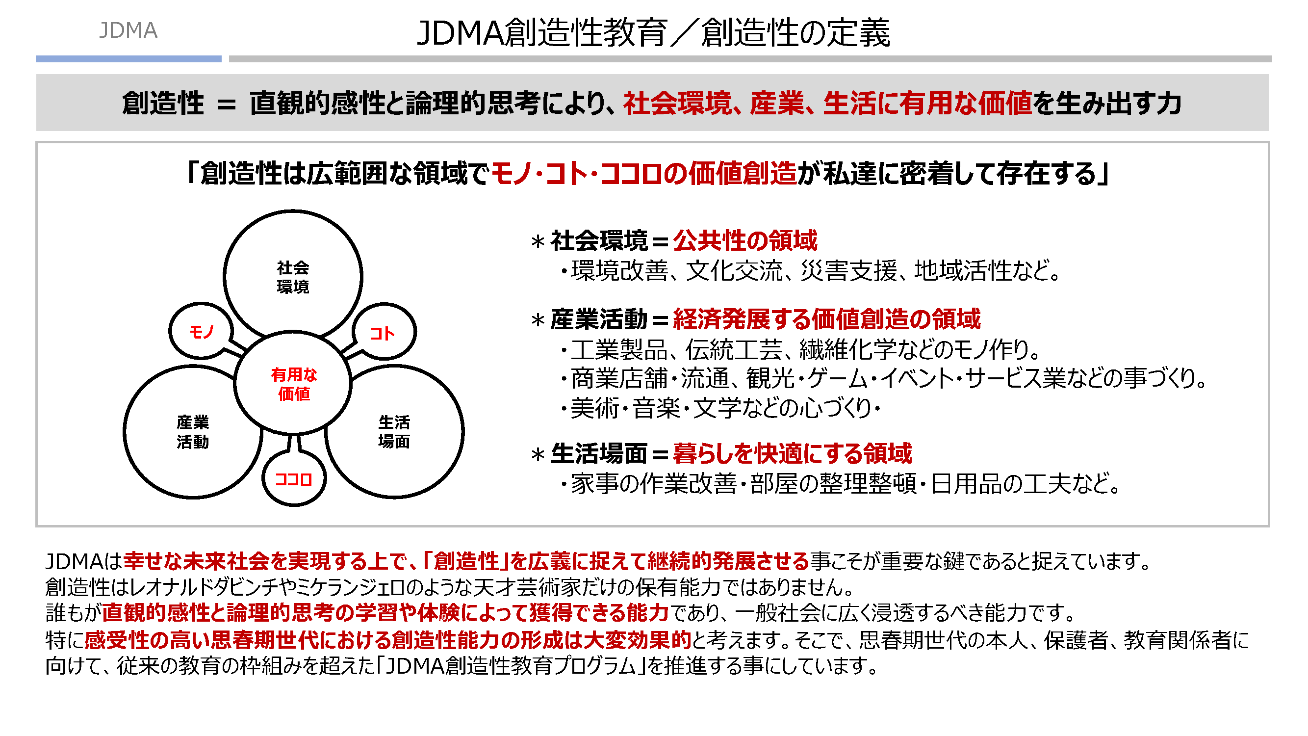 Education has been institutionalized from the perspective of social, industrial and lifestyle development, forming today's educational environment. Nowadays, "creativity = originality and usefulness" plays a very important role not only in the fields of art and design, but also in management, technology, production, distribution, consumption, society and life culture. JDMA is engaged in activities to activate creativity in order to create essential social value, and we believe that promotion of creativity education is indispensable for thinking about the future of Japan. And, in order to foster the next generation of "creators," we are advancing efforts that go beyond the conventional framework of education.